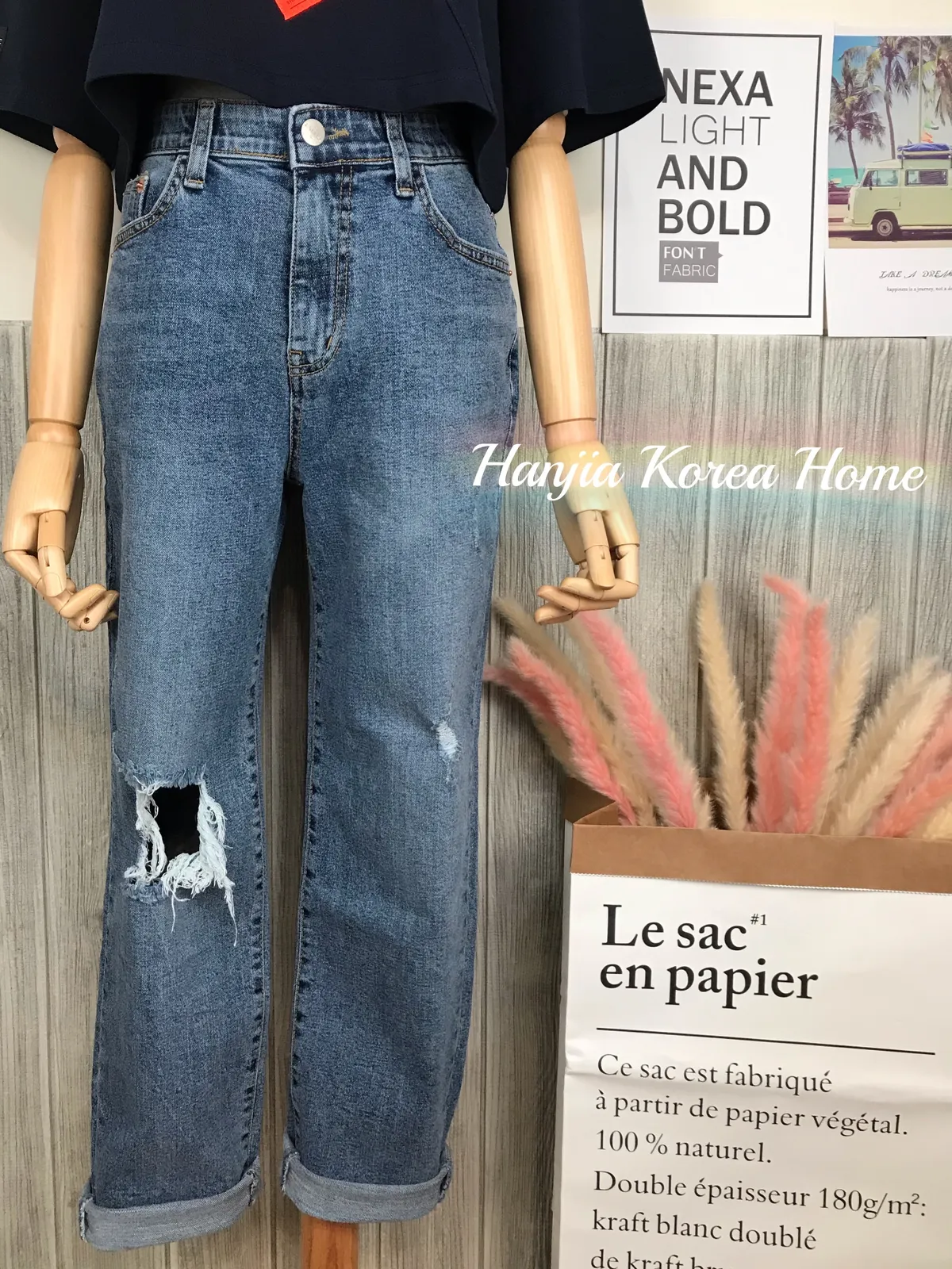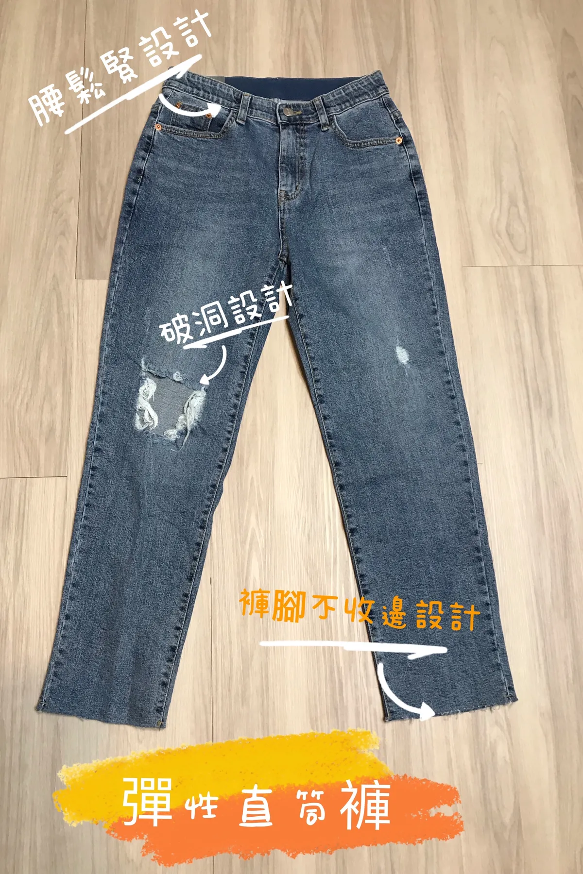 直筒腰鬆緊彈性破洞牛仔